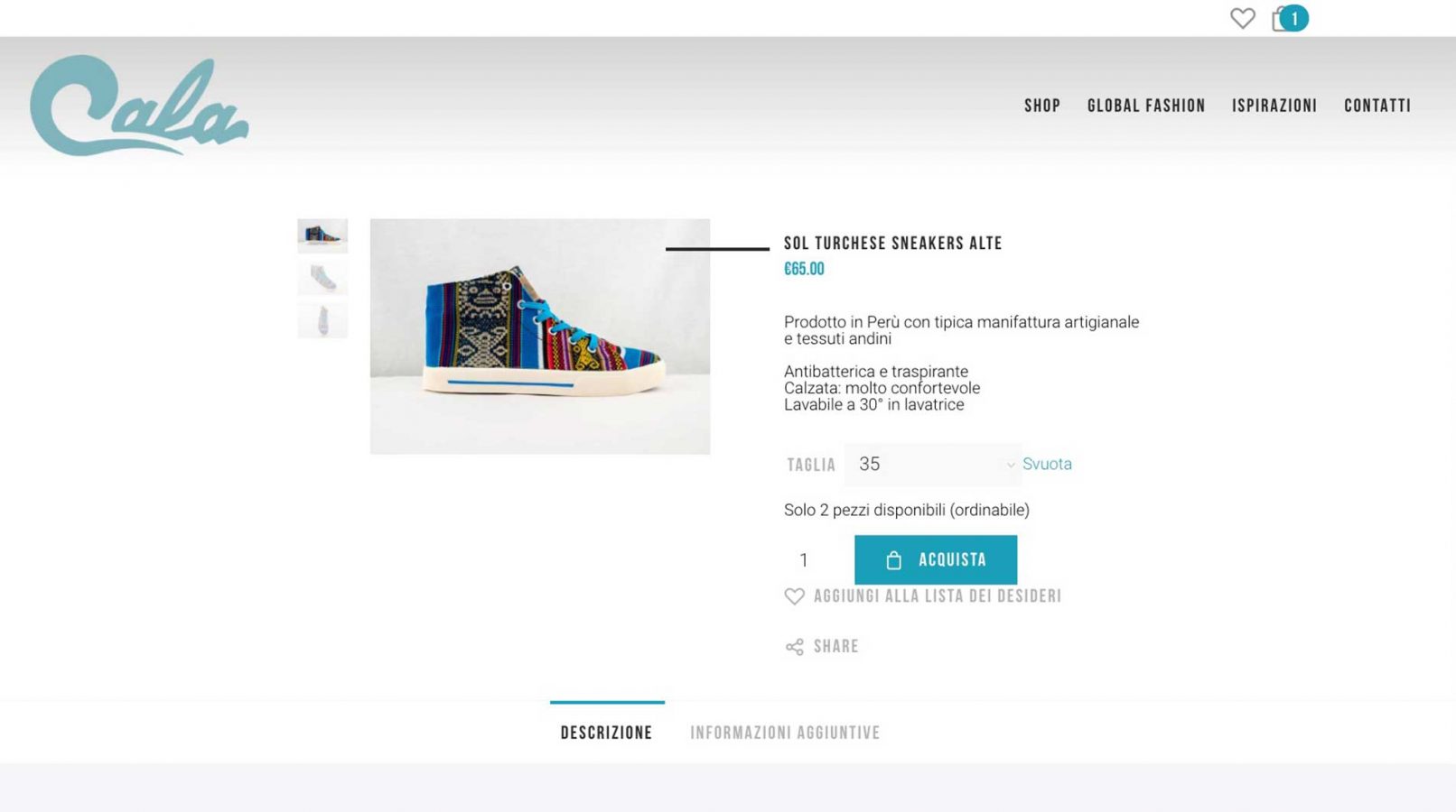 Cala si è rivolta a StudioBang! per curare l’immagine coordinata e la realizzazione del sito con e-commerce, dove è possibile acquistare i prodotti attraverso l’integrazione di una piattaforma specifica per la visualizzazione del prodotto e procedere alle transazioni bancarie in maniera sicura.